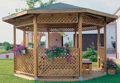 Gazebo, pergolati, pavimentazioni, grigliati e fioriere realizzati completamente in legno.