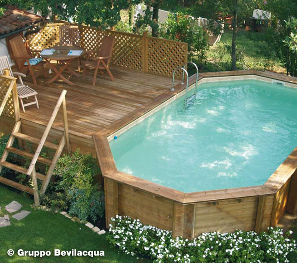 Soluzioni semplici e poco impegnative. Proponiamo piscine fuori terra in kit di montaggio, rivestite con profili di legno impregnato fresato a block-hous.